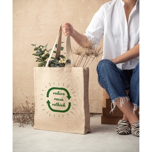 Sac en juco (275 g/m) avec poche interieure 100% coton (120 g/m) avec fermeture. Poignées en coton webbing bicolore 370 x 410 x 90 mm.