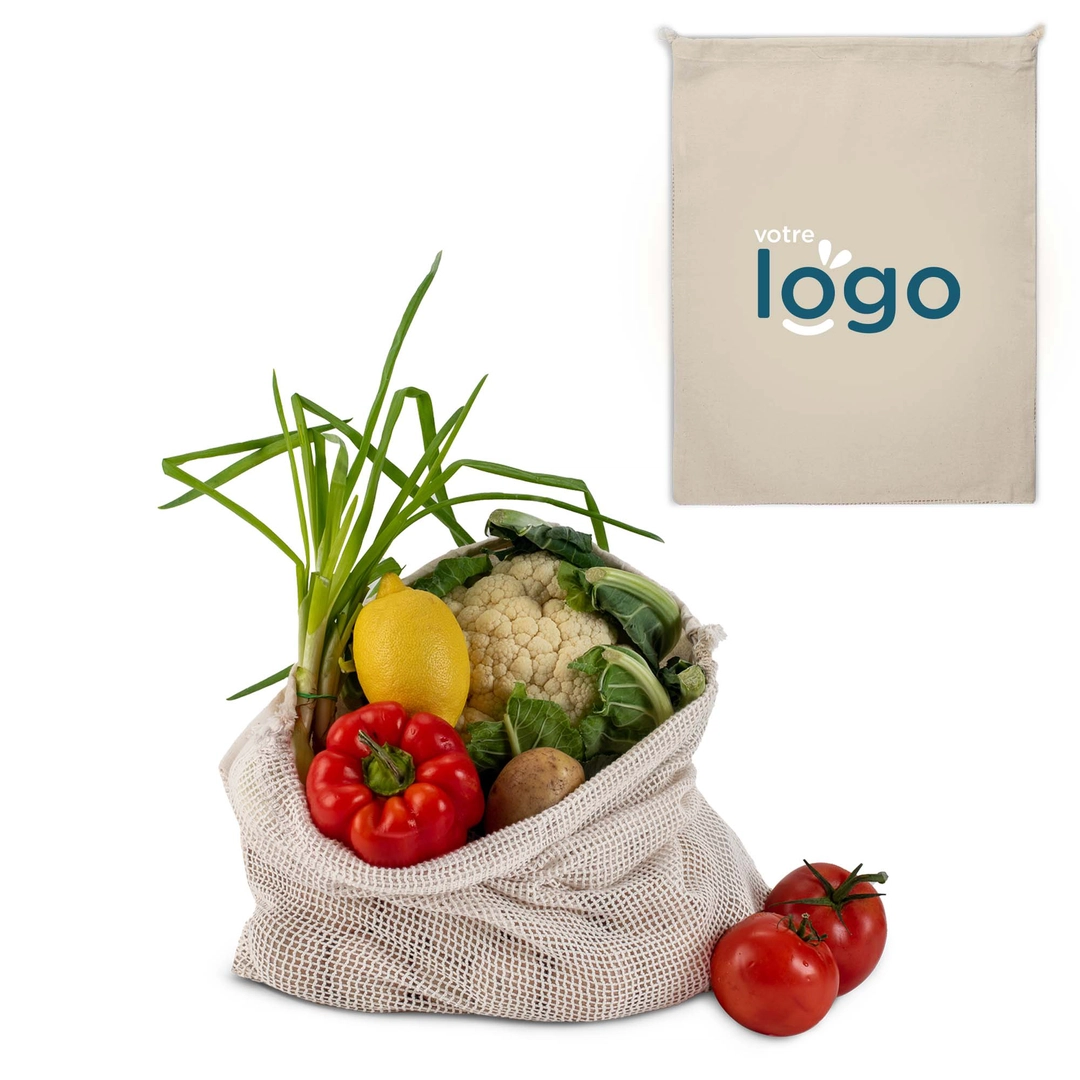 Il est fabriqué dans un coton non blanchi et convient parfaitement au transport des fruits et légumes.