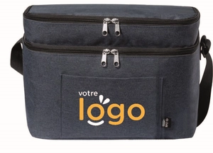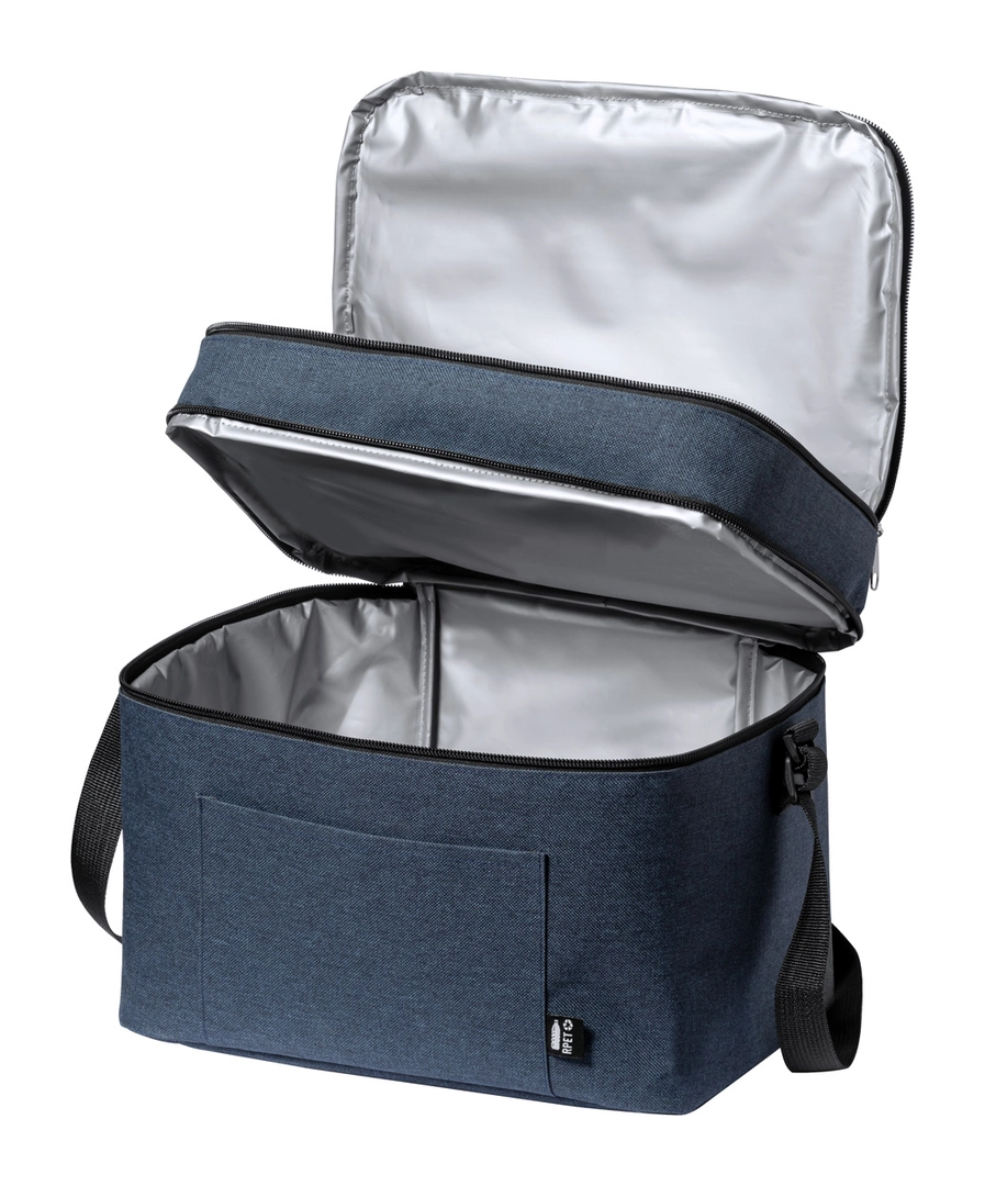Sac isotherme en polyester RPET 600D doublé en PEVA, avec 2 compartiments zippés et bandoulière réglable. Labélisé RPET.