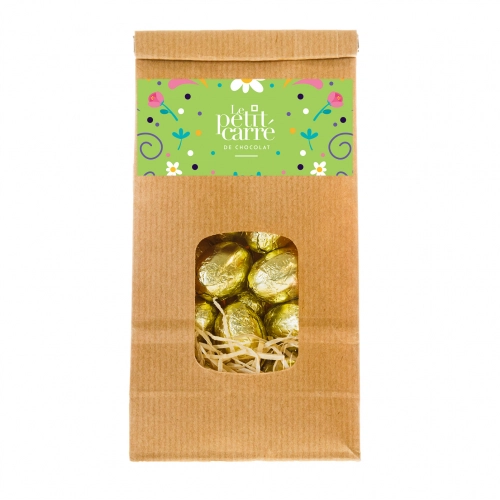 Offrez à vos clients des cadeaux publicitaires gourmands et personnalisés avec notre sachet de 100g d'œufs de Pâques au chocolat au lait praliné. Contactez Pantacom, spécialiste des objets et textiles publicitaires, pour obtenir un devis gratuit et un Bon à Tirer (BAT) personnalisé. Faites briller votre marque avec des chocolats de qualité.