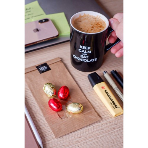 Offrez à vos clients des cadeaux publicitaires gourmands et personnalisés avec notre sachet de 100g d'œufs de Pâques au chocolat noir praliné. Contactez Pantacom, spécialiste des objets et textiles publicitaires, pour obtenir un devis gratuit et un Bon à Tirer (BAT) personnalisé. Faites briller votre marque avec des chocolats de qualité.