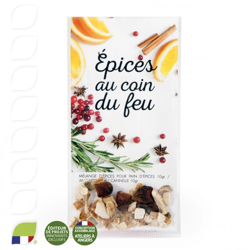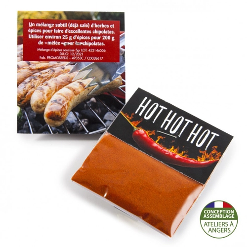 Présentation : ce sachet de graines personnalisé offre une large surface de communication sur sa carte. De la taille d'une petite main, il est imprimé à votre communication sur toute la surface visible. Nous vous suggérons un choix de différentes épices : biscuits de Noël, piment, épices pour barbecues, épices à pizza, etc.