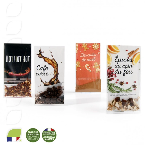 Avec ce goodies qui tient dans la main, offrez des épices en communiquant largement auprès de votre cible ! Sachet transparent avec carte et épices.