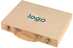 Set de dessin GAUDY : 12 crayons de couleur, 12 feutres, 12 crayons de cire, 12 pastels, 12 couleurs de peinture à l´eau, 1 taille-crayon, 1 crayon, 1 pinceau, 1 gomme, 1 règle (15 cm) et 1 colle, présenté dans une boîte en bois avec fermeture à clip et poignée de transport.