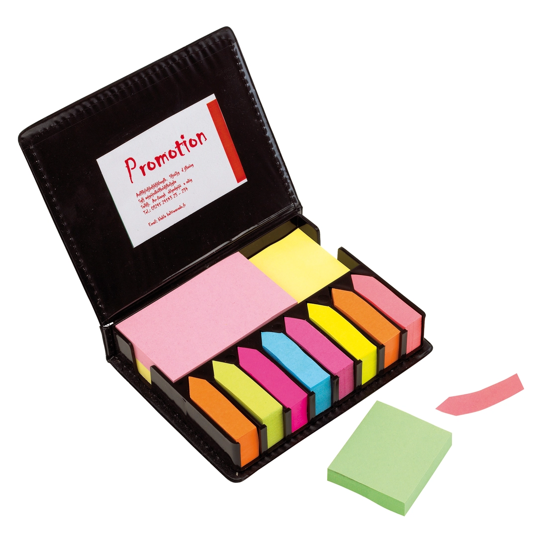Set de mémos REMIND ME. Comprend 8 petits mémos de différentes couleurs et 4 bloc de mémos dans un étui en simili-cuir.