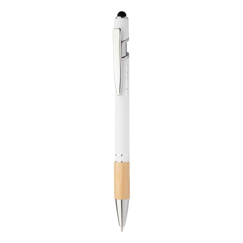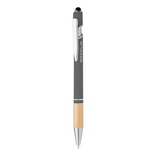 Stylo à bille stylet en aluminium avec embase en bambou et finition caoutchoutée.