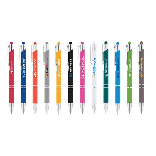 Le dernier venu de la famille CROSBY. Le stylo CROSBY softy stylet côté clip en finition soft touch est équipé d’un stylet en silicone assorti sur le bouton poussoir qui convient à tous les smartphones et tablettes. Le stylo publicitaire est l'un des goodies le plus impactant en matière de communication par l'objet. Ce stylo personnalisable est disponible dans une gamme de 14 couleurs éclatantes. Personnalisez ce stylo promotionnel aux couleurs de votre entreprise grâce à notre technique de marquage en ColourJet