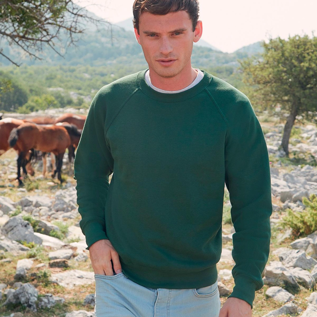 80% coton peigné, 20% polyester. Sweat manches raglan. Col, poignets et bas du corps en cote 1x1. Structure tubulaire. (Col. : 260 g/m²).