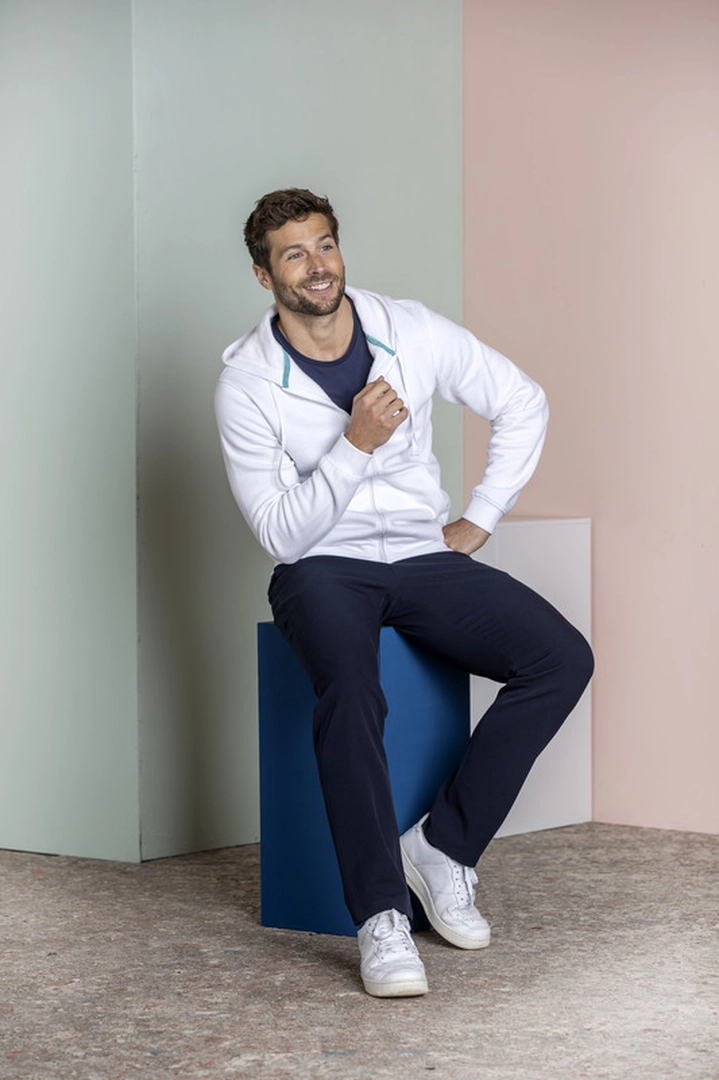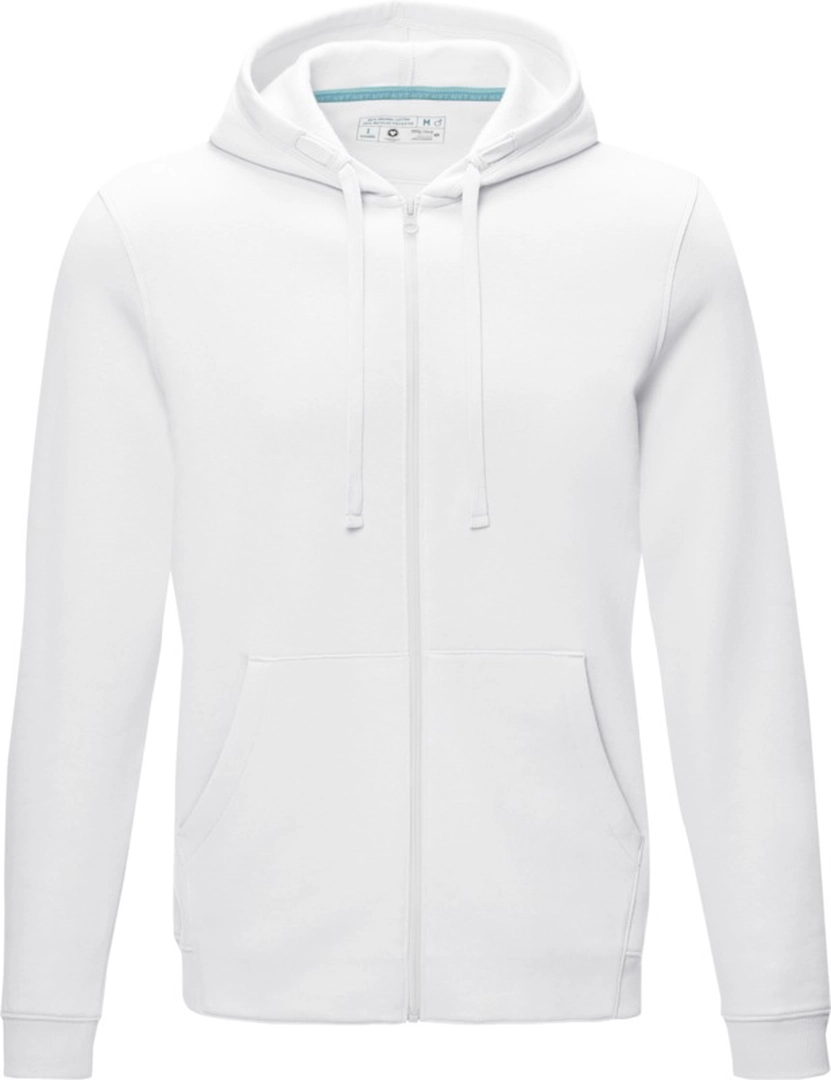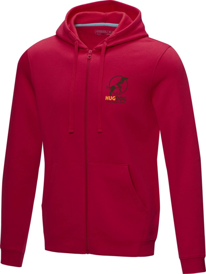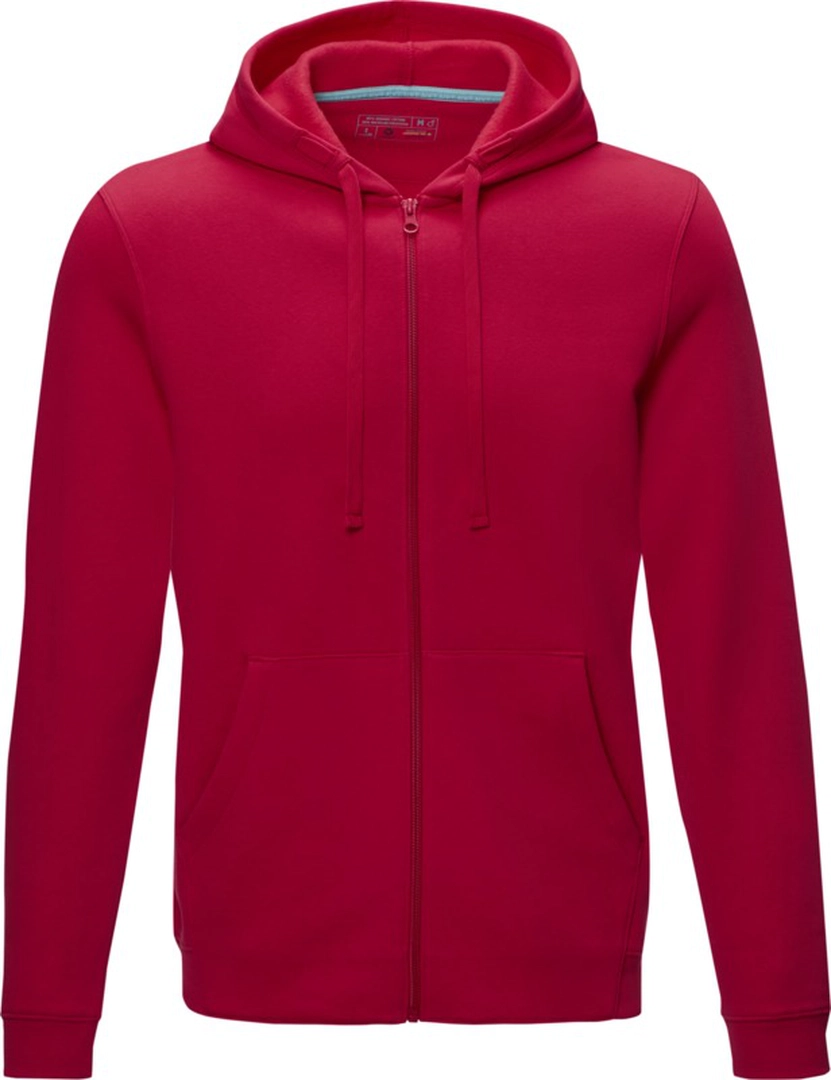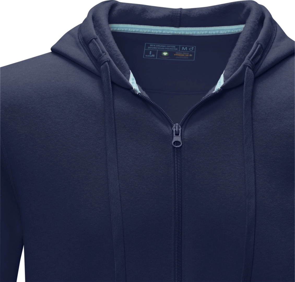 Vêtements promotionnels durables. Fermeture à glissière à spirale certifiée GRS au centre. Cordon de serrage certifié GOTS dans la capuche. Poche kangourou. Brossé à l'intérieur. Poignets côtelés plats. Ourlet du bas en tricot plat. Bande de propreté bicolore. Demi Lune. Étiquette principale en transfert pour un meilleur confort.
