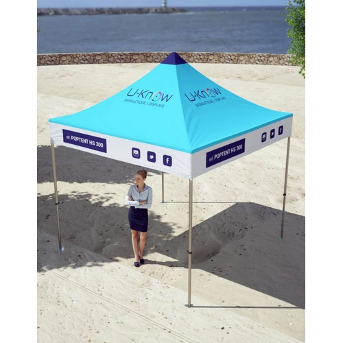 Tente popup 3x3m dépliante en acier. Ce barnum est particulièrement robuste. Sa structure est composée d'une armature hexagonale grise en acier de diamètre 40mm et d'épaisseur 0,7mm. Elle est personnalisée sur le toit et sur les portes en impression quadri numérique. Le toit et les portes de cette tonnelle sont en polyester Oxford 260g/m² avec enduction pour garantir l'impérméabilité et sont montés par Velcro sur la tente. La tente est livrée prête à monter dans un trolley de transport en Oxford 600D à roulettes.