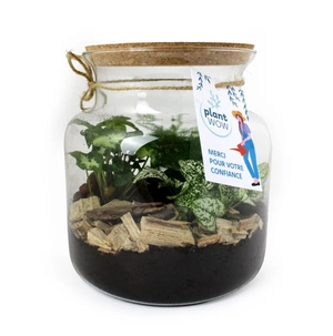 Ce terrarium en verre (Ø 190 mm x H 200 mm) est fermé par un couvercle en liège naturel (Ø 148 mm) personnalisable par gravure laser. À l’intérieur, trois plantes décoratives — Syngonium, Asparagus et Hypoestes — cohabitent dans un écosystème stable composé de terreau, copeaux de bois, roche volcanique et billes d’argile.