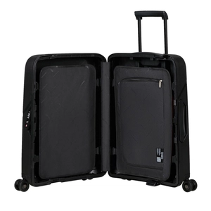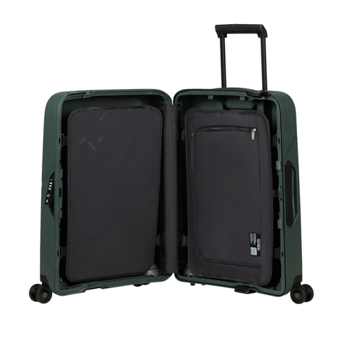 L'intérieur de Magnum Eco est à la fois très pratique et très simple. L'intérieur de la valise a une texture lisse et ne nécessite donc pas de doublure intérieure. Non seulement cela réduit l'utilisation de matériau supplémentaire, mais surtout, cela permet de nettoyer facilement l'intérieur. Les deux plateaux de séparation réglables en hauteur permettent d'emballer et de compresser soigneusement vos effets personnels.