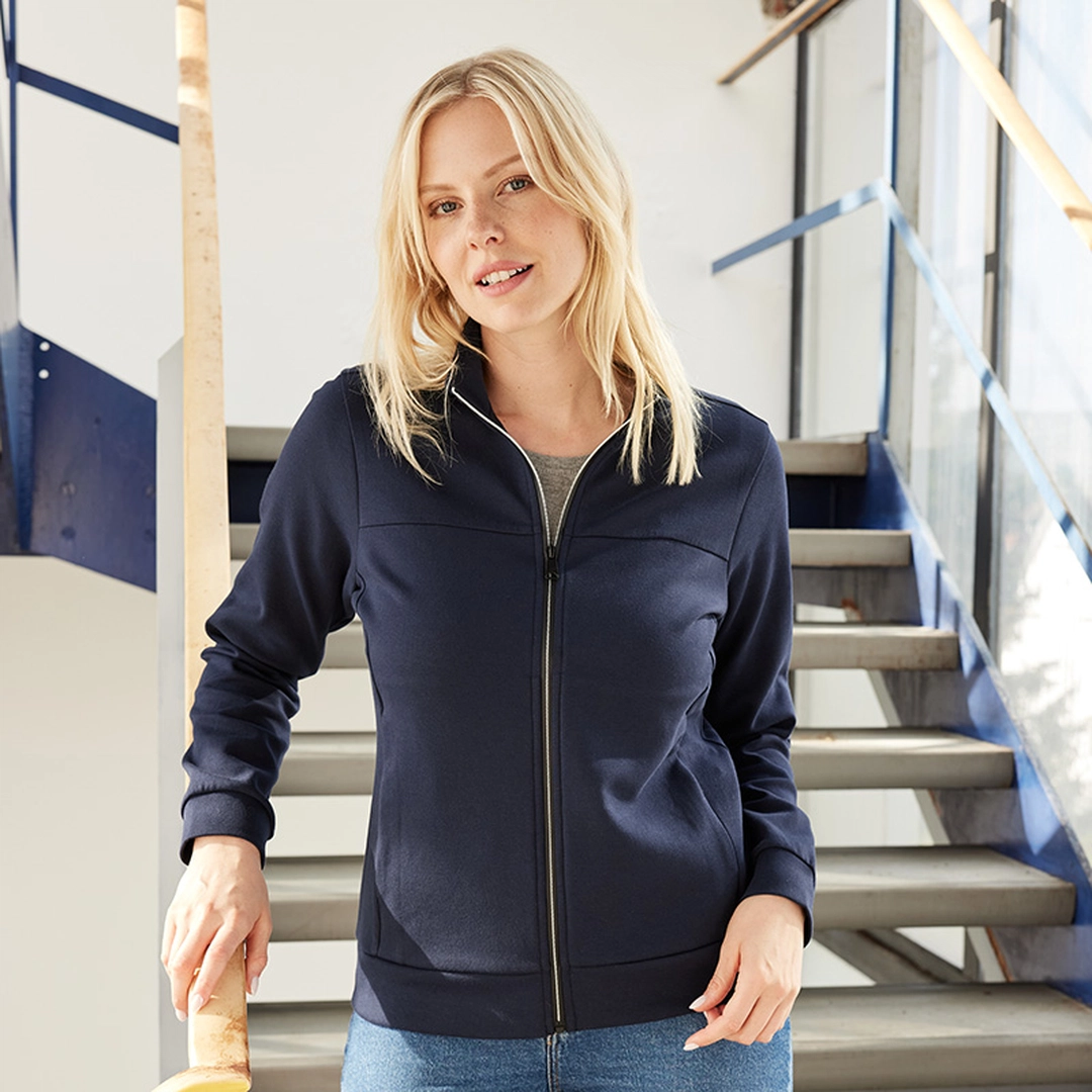 Introduisant la Veste Femme Daiber®, une fusion parfaite entre fonctionnalité, style et confort. Fabriquée à partir d'un mélange harmonieux de 47% de coton, 46% de polyester et 7% d'élasthanne, cette veste de 300 g/m² combine résistance, confort et flexibilité. Le tissu interlock, connu pour sa durabilité et sa douceur, se marie à l'élasthanne pour offrir une élasticité optimale, permettant à la veste de maintenir sa forme au fil du temps.