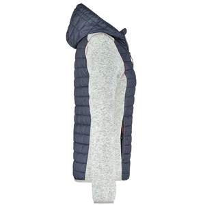100% polyester. Veste pour femme en tissu doux, chaud, facile d'entretien avec effet mélange, capuche avec motif matelassée en surpiqûre, coutures plates contrastées sur les manches, capuche réglable, fermeture zippée sur la longueur, 2 poches latérales zippées, 2 poches intérieures. taille ajustée.